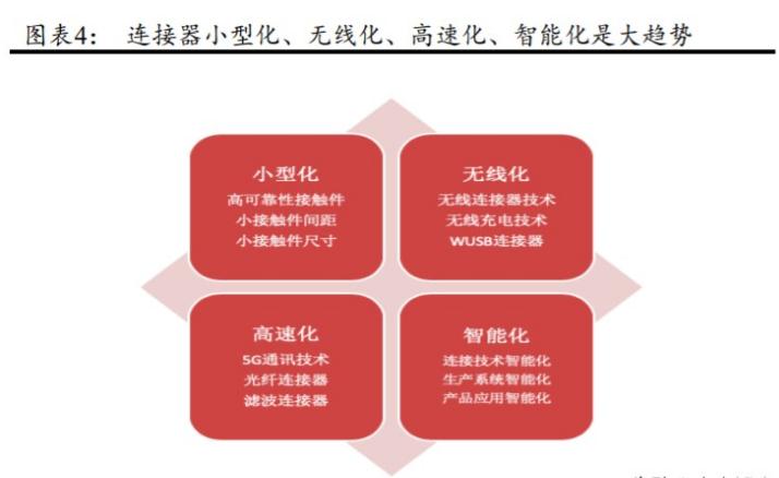 小型化、無(wú)線化、高速化、智能化連接器是主要趨勢(shì)。目前,全球連接器行業(yè)正處于以5G和新能源汽車為代表的新一輪創(chuàng)意需求的起點(diǎn)。在新能源汽車技術(shù)方面,——高功率密度電池組、電池充電航天電器、逆變器、DC-DC控制器3354等四種典型的電動(dòng)汽車系統(tǒng)都增加了大量的連接器,汽車電子化的步伐正在加快和普及。隨著供應(yīng)側(cè)電池等核心系統(tǒng)技術(shù)的不斷完善、產(chǎn)能中期增長(zhǎng)、需求側(cè)政策的刺激和消費(fèi)者需求偏好的轉(zhuǎn)變,新能源汽車領(lǐng)域可能正在進(jìn)入創(chuàng)新需求的起點(diǎn)。據(jù)航天電氣公司官網(wǎng)介紹,5G Massive MIMO技術(shù)直接導(dǎo)致基站天線發(fā)展的三大趨勢(shì):1)無(wú)源到有源天線發(fā)展,2)RRH和天線一體化,3)光纖取代饋線。就能耗而言,如基站的電源連接器,它可以滿足不斷增加的電流要求,并提供更小的封裝。對(duì)于通信領(lǐng)域常用的48V/12V/5V DC電源,其電源連接器的單芯(芯片)所承載的電流密度不斷增加,從30A40A50A60A甚至更高。同時(shí),設(shè)備小型化、緊湊化的發(fā)展趨勢(shì)要求連接器占用的空間更小。例如,高密度刀片服務(wù)器取代了數(shù)據(jù)中心的機(jī)架式服務(wù)器,運(yùn)行這些更緊湊的系統(tǒng)需要更高的電源密度和連接器信號(hào)密度。連接器行業(yè)深度報(bào)道:為什么要成為領(lǐng)導(dǎo)者