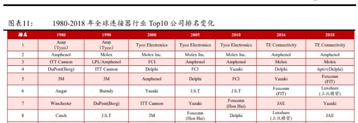 廣闊的市場(chǎng)空間為小廠家的反擊奠定了一定的基礎(chǔ)。據(jù)TTI引用畢曉普協(xié)理數(shù)據(jù),2018年全球連接器市場(chǎng)達(dá)到667.1億美元;據(jù)《全球市場(chǎng)洞察》報(bào)道,2018年全球電容器市場(chǎng)為190億美元,不到連接器市場(chǎng)的30%。集中度方面,根據(jù)郭巨公司公告,2018年占據(jù)電容器市場(chǎng)份額43%以上的MLCC環(huán)球CR5達(dá)到79%;然而,自1980年以來(lái),全球連接器市場(chǎng)僅從38%增長(zhǎng)到60%,市場(chǎng)壟斷程度明顯低于MLCC。在市場(chǎng)空間廣闊、集中度相對(duì)較低、對(duì)材料等底層技術(shù)積累要求較低、定制度高的背景下,國(guó)內(nèi)中小型連接器企業(yè)有一定的生存空間。一個(gè)更直觀的例子是,2000年中國(guó)加入世貿(mào)組織后,一些領(lǐng)域?qū)崿F(xiàn)了自由化。從2001年到2004年,杏樹(shù)(外資企業(yè))在百?gòu)?qiáng)連接器排行榜上排名第一。但逐漸被德潤(rùn)電子、航天電器、AVIC光電等國(guó)內(nèi)企業(yè)超越。在廣闊的市場(chǎng)規(guī)模下,這類企業(yè)以聚焦精品軌道為發(fā)展起點(diǎn),并逐漸占據(jù)一席之地。