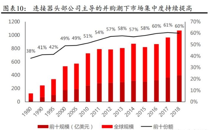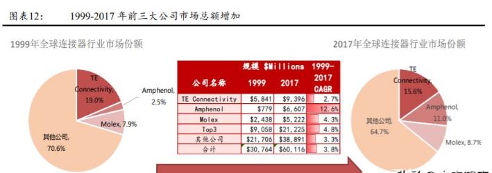 并購(gòu)浪潮和亞洲廠商的崛起沖擊了原有的競(jìng)爭(zhēng)格局,但全球整體競(jìng)爭(zhēng)格局相對(duì)穩(wěn)定,北美行業(yè)集中度有所提高。從1985年到2018年10月1日,Bishop Associates記錄到連接器行業(yè)完成并購(gòu)589起,2000年以后共完成并購(gòu)463起。在并購(gòu)浪潮中,三大連接器巨頭安費(fèi)諾、泰科、莫萊克斯一直在積極收購(gòu)部分競(jìng)爭(zhēng)對(duì)手。安費(fèi)諾從1999年到2018年收購(gòu)了52家公司。同期,泰科電子收購(gòu)了25家公司,Molex收購(gòu)了27家公司。大規(guī)模的M&A在一定程度上推動(dòng)了行業(yè)集中度的提高,前三名公司的市場(chǎng)份額從1999年的29.4%上升到2017年的64.7%。值得注意的是,1980年排名前10的公司中沒(méi)有亞洲公司,但2016年排名前10的有6家亞洲公司,包括李勛京密、富士康(鴻海)、雅崎、JAE、J.S.T和廣瀨,這也與亞洲電子制造能力的提高和亞洲連接器市場(chǎng)需求的擴(kuò)大密切相關(guān)。此外,一些早期的大公司被M&A活動(dòng)中的較大實(shí)體所吸收,例如杜邦公司被弗拉馬通公司(FCI)收購(gòu),然后又被安費(fèi)諾公司收購(gòu)。雖然全球連接器行業(yè)前十大廠商的地位發(fā)生了很大變化,但行業(yè)整體競(jìng)爭(zhēng)格局相對(duì)穩(wěn)定。比如1980年以來(lái),TE Connectivity一直是最大的連接器公司,從AMP更名為泰科國(guó)際,再更名為泰科電子,再更名為現(xiàn)在的TE Connectivity。Molex和Amphenol都在前十。1980年,未能在2018年保持前十名的前十家公司包括ITT坎農(nóng)(坎農(nóng))、伯格3M、溫徹斯特(Winchester)、奧格特(Ogut)、辛奇連接解決方案(Cinch Connectivity Solutions)和伯恩迪(Burndy),其中大部分被總部公司收購(gòu)。