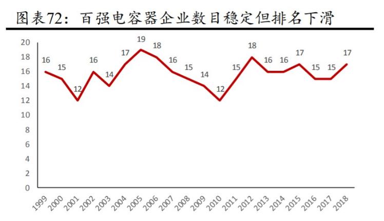從數(shù)字上看,進(jìn)入中國(guó)電子元器件企業(yè)百?gòu)?qiáng)名單的連接器企業(yè)數(shù)量逐漸增多。從1999年到2018年,進(jìn)入中國(guó)電子元器件百?gòu)?qiáng)名單的連接器企業(yè)數(shù)量逐步增加,從1999年的2家增加到2018年的13家。同時(shí),進(jìn)入百?gòu)?qiáng)榜單的連接器企業(yè)排名也逐漸提高。在2008年(含)之前,國(guó)內(nèi)還沒(méi)有連接器企業(yè)進(jìn)入前20名,之后以李勛精密和AVIC光電為代表的公司一步步走到了前列。2015年后,進(jìn)入中國(guó)零部件前20名的連接器企業(yè)數(shù)量穩(wěn)定在3-4家。但連接器公司進(jìn)入前100強(qiáng)的數(shù)量增加,意味著其他電子元器件公司的排名在下降,競(jìng)爭(zhēng)力逐漸喪失。我們選擇了同樣廣泛使用的電容器的競(jìng)爭(zhēng)模式作為比較對(duì)象。主要電容器企業(yè)的數(shù)量(包括MLCC和薄膜電容器等。)進(jìn)入百?gòu)?qiáng)榜單保持相對(duì)穩(wěn)定,但整體排名持續(xù)下滑。例如,廣東奉化高新從1999年的第4位跌至2018年的第11位,同期南通江海從第19位跌至第36位。